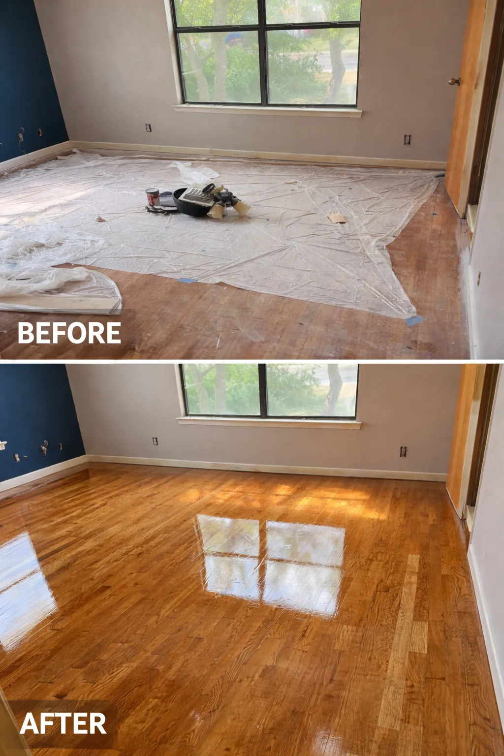 A fresh coat of durable finish is applied to restore shine and protect the hardwood floor from future wear.